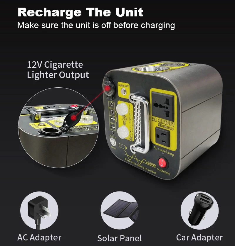 One of the feature of our product is a lot outputs . With 2 * AC output , 2 USB putputs , 2 DC/12V output,you can charge laptop and cellphone in the same time. Lack of outputs won’t never be a problem after you buy this Power Station.